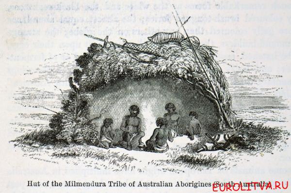 • Гравюра с изображением австралийских аборигенов племени Милмендура в их хижине