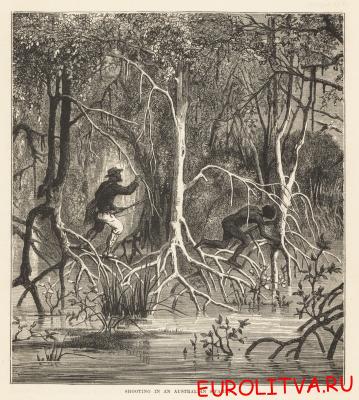 • Британский колонист охотится с проводником-аборигеном в мангровых болотах, XIX век. Гравюра на дереве из книги Роберта Брауна «Расы человечества», издательство Cassell, Petter and Galpin, Лондон, 1873 год