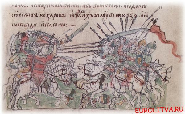- Сражение войска Святослава с войском хазарского «князя Кагана», закончившееся победой Руси (965). Миниатюра из Радзивилловской летописи, конец XV века.