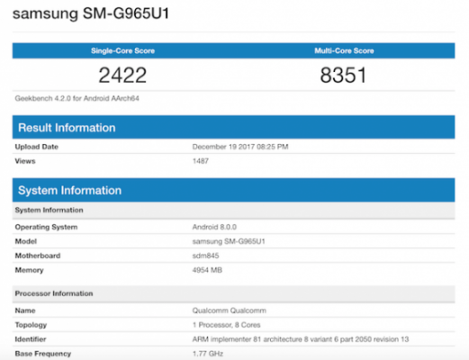 Бенчмарк подтвердил такие параметры Samsung Galaxy S9+ с модельным номером SM-G965U как топовый процессор Qualcomm Snapdragon 845, 6 ГБ оперативной памяти и операционную систему Android 8.0 Oreo. Также он показал впечатляющую производительность смартфона. Samsung Galaxy S9+ набрал 2422 балла в одноядерном тесте и 8351 балл в многоядерном тесте. Доступные в списках Geekbench данные показывают, что ни один смартфон Samsung ранее не набирал заметно больше 2000 и 6500 баллов, соотвественно.
