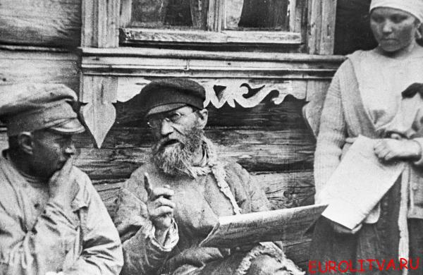 - Крестьяне читают газету, в которой опубликованы ленинские декреты о земле и мире. Впервые декрет был опубликован во всех центральных газетах 10 ноября 1917 года