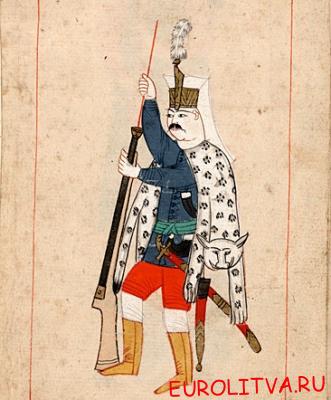 - Янычар с мушкетом. Миниатюра из «Книги костюмов» Клеса Роламба[укр.] (1657). Национальная библиотека Швеции