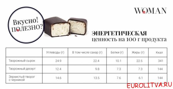 По словам Елены, творожный десерт и зернистый творог с черничным вкусом почти не отличаются по питательной ценности — в зернистый творог добавлено больше соли и меньше творога.