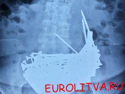 Рентгенологическое исследование брюшной полости показал, что громадный инородный объект создает опасность перфорации стен желудка, поэтому хирурги взялись за срочную операцию под общим наркозом.